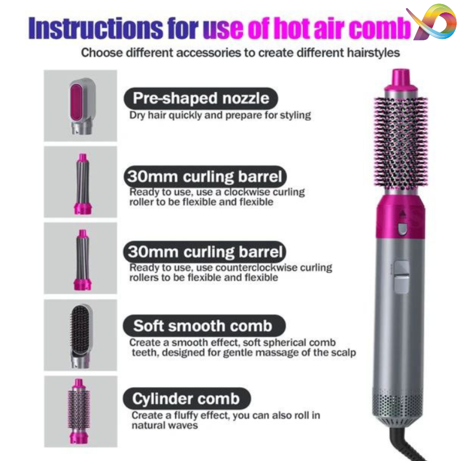 Este cepillo secador 5 en 1 combina secadora, rizador y alisador en una sola herramienta, ideal para cabello seco o húmedo. Gracias a su tecnología de aire caliente con iones negativos, seca rápidamente, reduce el frizz y deja tu melena suave, brillante y con volumen.